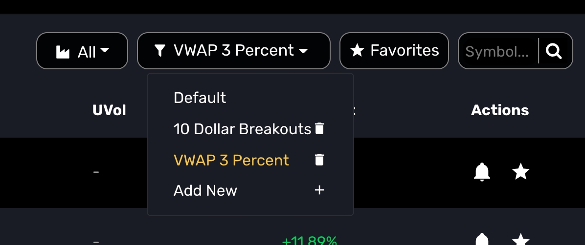 After selecting the Add New + item in the Custom Filter drop-down, you can add remove up to 15 criteria to build your filter depending on if using Pro or Pro+ plan. You may also define your preset view options. When defined, you can automatically load the column sort, timeframe, and preferred categories. You may also share these settings with other traders with the Share link.
