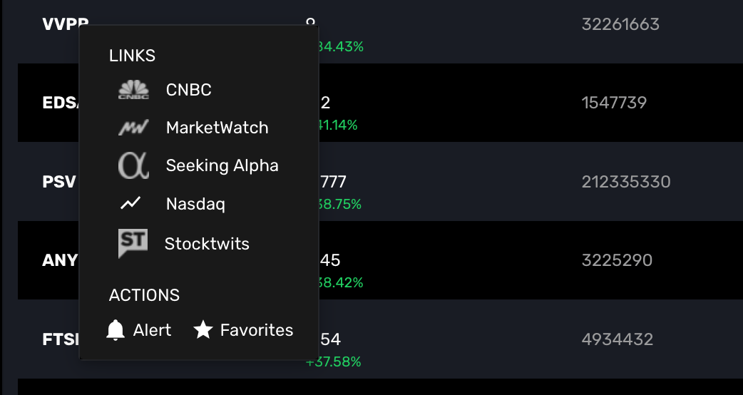 Within MOMO you may launch popular media sources to help find news and data supporting the price movement. Once selected, MOMO will launch a new browser tab for the desired news and stock symbol.