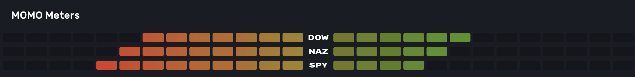 The MOMO Meters show a rolling market breadth over a 3 min period. Each row represents the current number of winners to losers for the Dow, Nasdaq, and SPY. How to use the MOMO Meters: Markets can change direction quickly and swings based on index percentage changes are slow to highlight this swing especially particularly since indexes are cap weighted.