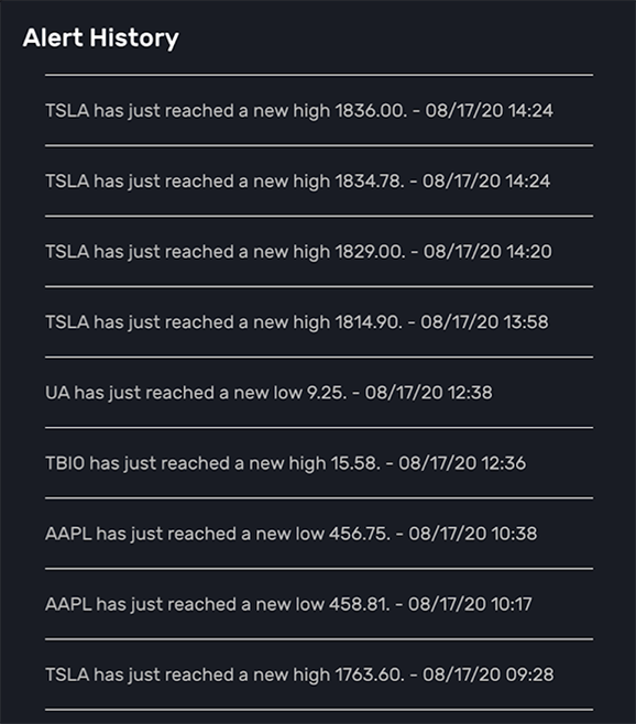 Browser notifications are easy to miss and quickly disappear. Alert history solves this problem so you can review alerts as needed.